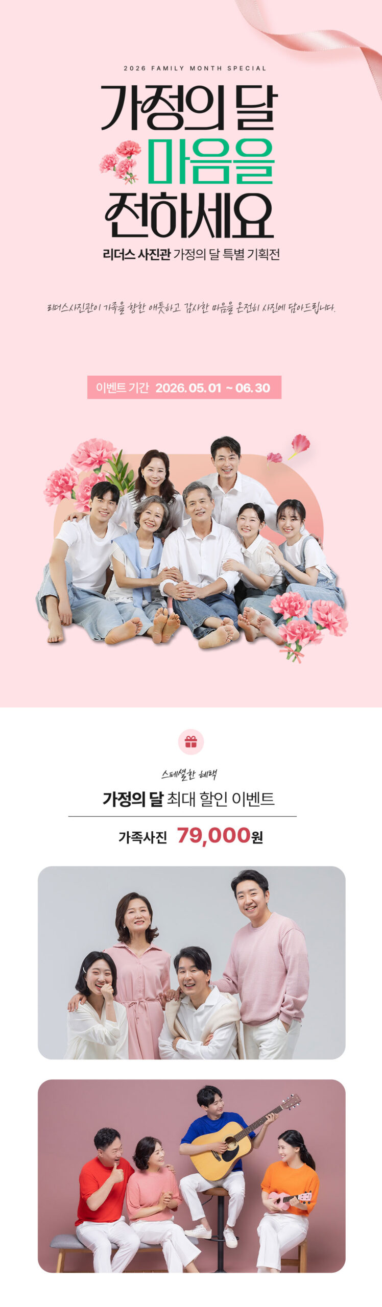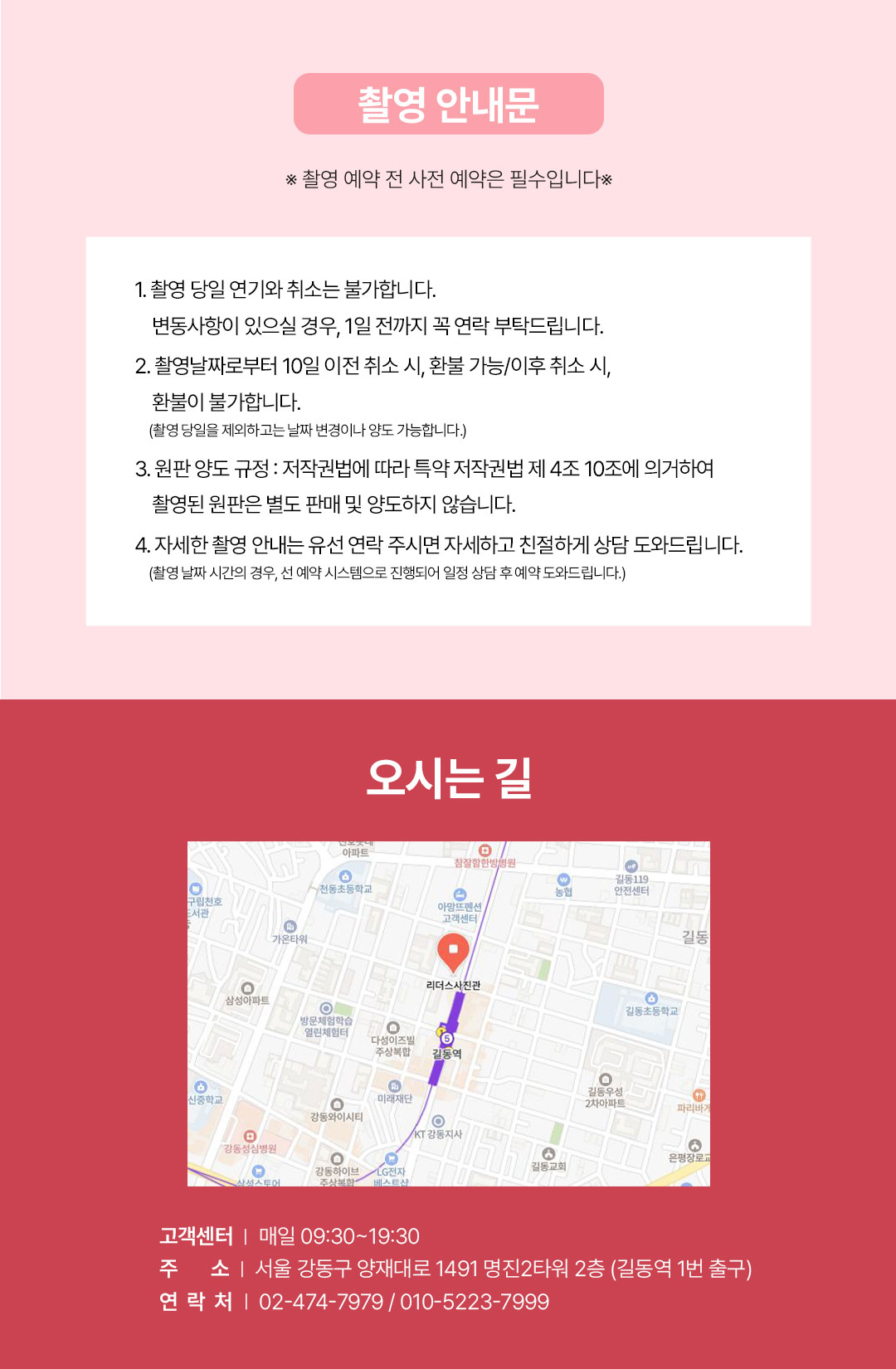 리더스사진관 오시는 길 리더스사진관 서울특별시 강동구 양재대로 1491, 명진2타워 2층 영업시간 09:30~19:30 전화번호 / 계좌번호 02-474-7979 / 신한은행 100-023-239683 이순행 가족사진 특가상품 촬영 신청 이 양식을 작성하려면 브라우저에서 JavaScript를 활성화하십시오.이 양식을 작성하려면 브라우저에서 JavaScript를 활성화하십시오.성함 *연락처 *촬영 상품 선택 *가족사진리마인드 웨딩환갑/칠순/팔순 기념일기타희망 촬영 날짜 및 시간 연락처 개인정보 문의사항 촬영 인원문의사항개인정보 수집 및 이용 동의 *개인정보처리방침에 동의합니다.강동구사진여행(이하 ‘회사’라 한다)는 개인정보 보호법 제30조에 따라 정보 주체의 개인정보를 보호하고 이와 관련한 고충을 신속하고 원활하게 처리할 수 있도록 하기 위하여 다음과 같이 개인정보 처리지침을 수립, 공개합니다. 제1조 (개인정보의 처리목적) 회사는 다음의 목적을 위하여 개인정보를 처리합니다. 처리하고 있는 개인정보는 다음의 목적 이외의 용도로는 이용되지 않으며, 이용 목적이 변경되는 경우에는 개인정보보호법 제18조에 따라 별도의 동의를 받는 등 필요한 조치를 이행할 예정입니다. 1. 홈페이지 회원 가입 및 관리 회원 가입 의사 확인, 회원제 서비스 제공에 따른 본인 식별․인증, 회원자격 유지․관리, 제한적 본인확인제 시행에 따른 본인확인, 서비스 부정 이용 방지, 만 14세 미만 아동의 개인정보처리 시 법정대리인의 동의 여부 확인, 각종 고지․통지, 고충 처리 등을 목적으로 개인정보를 처리합니다. 2. 재화 또는 서비스 제공 물품 배송, 서비스 제공, 계약서 및 청구서 발송, 콘텐츠 제공, 맞춤서비스 제공, 본인인증, 연령인증, 요금 결제 및 정산, 채권추심 등을 목적으로 개인정보를 처리합니다. 3. 고충 처리 민원인의 신원 확인, 민원사항 확인, 사실조사를 위한 연락․통지, 처리 결과 통보 등의 목적으로 개인정보를 처리합니다. 제2조 (개인정보의 처리 및 보유기간) ① 회사는 법령에 따른 개인정보 보유, 이용 기간 또는 정보주체로부터 개인정보를 수집 시에 동의 받은 개인정보 보유, 이용 기간 내에서 개인정보를 처리, 보유합니다. ② 각각의 개인정보 처리 및 보유 기간은 다음과 같습니다. 1. 홈페이지 회원 가입 및 관리 : 사업자/단체 홈페이지 탈퇴 시까지 다만, 다음의 사유에 해당하는 경우에는 해당 사유 종료 시까지 1) 관계 법령 위반에 따른 수사, 조사 등이 진행 중인 경우에는 해당 수사, 조사 종료 시까지 2) 홈페이지 이용에 따른 채권 및 채무관계 잔존 시에는 해당 채권, 채무 관계 정산 시까지 2. 재화 또는 서비스 제공 : 재화․서비스 공급완료 및 요금결제․정산 완료 시까지 다만, 다음의 사유에 해당하는 경우에는 해당 기간 종료 시까지 1) 「전자상거래 등에서의 소비자 보호에 관한 법률」에 따른 표시․광고, 계약내용 및 이행 등 거래에 관한 기록 - 표시․광고에 관한 기록 : 6월 - 계약 또는 청약 철회, 대금결제, 재화 등의 공급기록 : 5년 - 소비자 불만 또는 분쟁 처리에 관한 기록 : 3년 2) 「통신비밀보호법」 제41조에 따른 통신사실확인자료 보관 - 가입자 전기통신일시, 개시․종료 시간, 상대방 가입자 번호, 사용도수, 발신기지국 위치추적자료 : 1년 - 컴퓨터 통신, 인터넷 로그 기록자료, 접속지 추적자료 : 3개월 제3조 (개인정보의 제3자 제공) ① 회사는 정보주체의 개인정보를 제1조(개인정보의 처리목적)에서 명시한 범위 내에서만 처리하며, 정보주체의 동의, 법률의 특별한 규정 등 개인정보 보호법 제17조에 해당하는 경우에만 개인정보를 제3자에게 제공합니다. ② 회사는 다음과 같이 개인정보를 제3자에게 제공하고 있습니다. - 개인정보를 제공받는 자 : <예) (주) OOO 카드> - 제공받는 자의 개인정보 이용목적 : <예) 이벤트 공동개최 등 업무제휴 및 제휴 신용카드 발급> - 제공하는 개인정보 항목 : <예) 성명, 주소, 전화번호, 이메일주소, 카드결제계좌정보> - 제공받는 자의 보유, 이용기간 : <예) 신용카드 발급계약에 따른 거래기간동안> 제4조(개인정보처리의 위탁) ① 회사는 원활한 개인정보 업무처리를 위하여 다음과 같이 개인정보 처리업무를 위탁하고 있습니다. - 위탁받는 자 (수탁자) : (주)아임웹 - 위탁하는 업무의 내용 : 쇼핑몰 호스팅 서비스의 시스템 제공, 모바일 앱 서비스, 마케팅 서비스 및 부가, 제휴서비스 제공 및 알림톡, 친구톡, 문자메시지 발송대행 서비스 등 - 위탁받는 자 (수탁자) : OOO PG - 위탁하는 업무의 내용 : 결제 및 에스크로 업무 - 위탁받는 자 (수탁자) : OOO 택배 - 위탁하는 업무의 내용 : 상품 배송 업무 - 위탁받는 자 (수탁자) : OOO 고객센터 - 위탁하는 업무의 내용 : 고객상담 업무 - 위탁받는 자 (수탁자) : OOO - 위탁하는 업무의 내용 : 본인확인 업무 ② 회사는 위탁계약 체결 시 개인정보 보호법 제25조에 따라 위탁업무 수행목적 외 개인정보 처리금지, 기술적․관리적 보호조치, 재위탁 제한, 수탁자에 대한 관리․감독, 손해배상 등 책임에 관한 사항을 계약서 등 문서에 명시하고, 수탁자가 개인정보를 안전하게 처리하는지를 감독하고 있습니다. ③ 위탁업무의 내용이